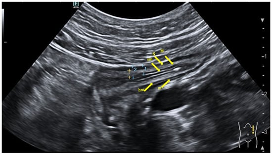 Bowel wall stratification at bowel ultrasound evaluation. hm: hyperechoic lumen interface of the mucosa; m: mucosa (hypoechoic); sm: submucosa (hyperechoic); M: muscolaris propria (hypoechoic); S: serosa (hyperechoic).