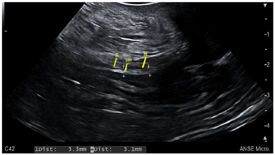 Trans-perineal Ultrasound (TPUS) window in a mild active ulcerative proctitis. sm: submucosa (hyperechoic); M: muscolaris propria (hypoechoic); S: serosa (hyperechoic).