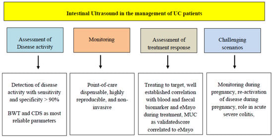 Ulcerative colitis (UC) is a chronic inflammatory bowel disease (IBD), mainly involving the superficial mucosal layer of continuous colonic segments, including the rectum []. UC incidence and prevalence are constantly increasing, suggesting an overall improvement in the diagnostic process, concomitantly to long-lasting survival []. The Selecting Therapeutic Targets in Inflammatory Bowel Disease (STRIDE) consensus established the treat-to-target strategy with tight monitoring of the UC course, possibly adjusting therapies to stop disease progression []. The recently adjourned STRIDE II initiative has implemented the importance of non-invasive monitoring in UC control through periodical fecal and serum biomarkers evaluation and using intestinal ultrasound (IUS) assessment []. IUS has demonstrated feasibility in IBD diagnosing and monitoring, particularly in Crohn’s disease (CD), thanks to high patient tolerability and elevated standard of accuracy []. The nature of UC is considered mainly a “mucosal” disease, involving predominantly the lower segments of the colon, easily reachable with sigmoidoscopy, and has obscured its use for years. Recently, the use of IUS in UC has been revolutionized, provided that bowel wall thickness (BWT) has been evaluated as the most relevant marker of inflammatory activity in IBD, even in UC []. Together with the other ultrasound features compatible with gut inflammation, the adoption of IUS in UC both in routine practice and in clinical trials has grown enormously []. IUS in UC has gained rapid consensus among IBD experts for its good correlation with endoscopic activity and for accurately reflecting the stage of UC inflammation []. In addition, the “point-of-care” availability of this technique allows prompt therapeutic adjustments, improving clinical decision making and patient outcomes. For this reason, recent guidelines state the IUS’s role in detecting activity and monitoring treatment response in UC, even if the concept of transmural remission is not yet standardized, as in CD [,]. This review aims to present all the latest insights into the use of IUS for UC assessment, including activity detection and evaluation, and the tight monitoring of treatment response.