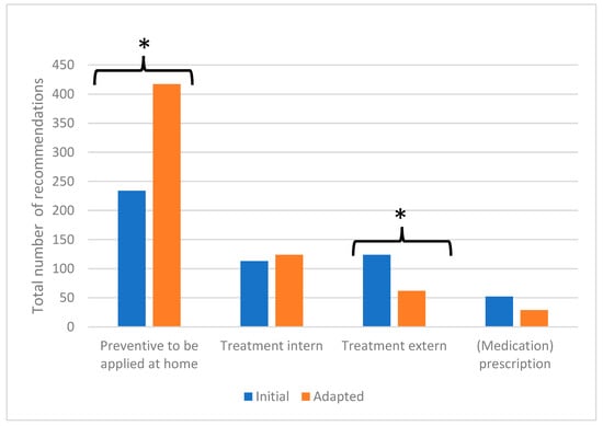 For the 139 participants that visited both designs, a total of 523 recommendations were given in the initial design and 628 recommendations in the adapted design. This resulted in a significant increase in the average number of recommendations from 3.7 to 4.6 per participant. Figure 1 shows the total number of recommendations given to the 139 participants at both follow-up clinics in each of the four domains. Most recommendations were preventive in nature and could be applied at home, with 45% (n = 234) of the total number of recommendations in the initial design increasing to 66% (n = 417) in the adapted design (p < 0.001). A decrease in the number of recommendations was made regarding external treatment, which went from 24% (n = 124) in the initial design to 10% (n = 62) in the adapted design.