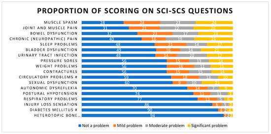 The score distribution on the separate questions of the SCI-SCS, including the two added questions regarding sleep problems and weight problems, is shown in Figure 2. On average, every participant indicated at least mild problems with six different SHCs on the original SCI-SCS and seven on all 18 questions used in this study. The SHCs reported by more than half of the participants as at least a mild problem were muscle spasms, joint and muscle pain, bowel dysfunction, chronic neuropathic pain, sleep problems, bladder dysfunction and urinary tract infections.