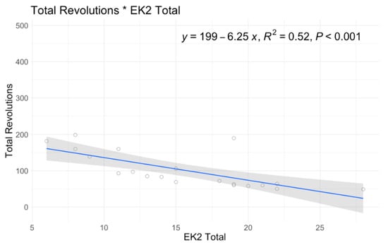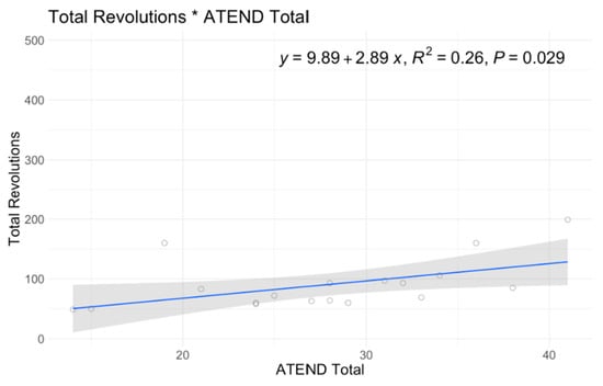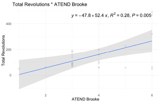 In single variable associations, total revolutions was significantly correlated with RULM (p < 0.001), ATEND (p = 0.029), EK2 (p < 0.001), and Brooke Score (p = 0.005) (Table 4). Higher RULM and ATEND scores were significantly associated with more revolutions (r = 8.15; r = 2.89) (Figure 4 and Figure 5). Individuals with higher Brooke Scores (better function) achieved higher revolutions as well (r = 52.4) (Figure 6), while higher EK2 scores correlated significantly with 6.25 fewer revolutions per point change (Figure 7). Performance fatigability was found to have a minimal and statistically insignificant correlation with the Fatigue Severity Scale (FSS) (p = 0.365, r = −0.21) (Table 4).