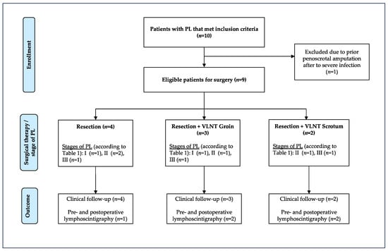 However, our conclusions remain suggestive as our study encompasses a limited number of cases as well as three different therapeutic approaches in an already small study population (resection alone and in combination with a VLNT into the groin or the scrotum). This is a clear limitation of our study. Moreover, our suggested algorithm is predominantly based on our clinical experience as well as similar protocols that were presented previously for other areas affected by chronic lymphedema (Figure 5) [23,25]. Thus, large-scale multicentric studies, with a prospective and randomized study design, are warranted. These would overcome the limitations caused by the low overall incidence of PL. A future study design should include a prospective assessment of the possible benefit of VLNT into the scrotum to effectively treat PL. Additionally, our study lacks objective outcome measurements for the quality of life as well as aesthetic aspects. While it seems highly plausible that these parameters are improved after treatment (Figure 2 and Figure 4), the lack of an objective assessment of these is a limitation of this study.