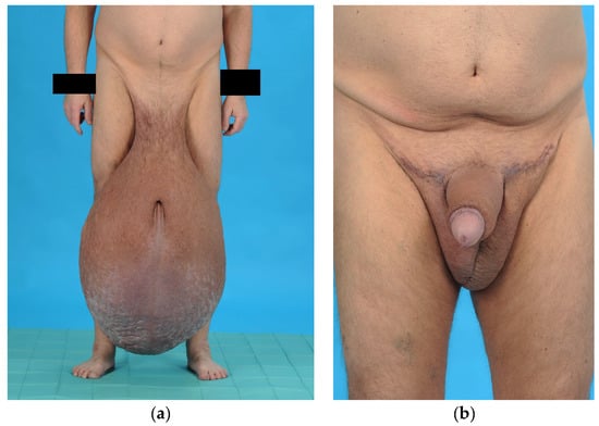 (a) Patient 1 with giant stage III penoscrotal lymphedema (PL), according to the classification in Table 1, before treatment and (b) 6 weeks after surgery (resection and flap reconstruction of scrotum and penis).