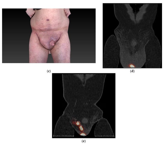Images of advanced stage III penoscrotal lymphedema (PL), according to the classification in Table 1, (patient 8) (a) before treatment, (b) during surgery, and (c) after treatment. Panels (d,e) show low-dose SPECT-CT scans, before and after surgery. At initial presentation, the patient suffered from severe local infection and folliculitis and was therefore treated with long-term antibiotics (a). Surgery included resection and flap reconstruction of scrotum and penis combined with a vascularized lymph node transfer (VLNT) into the scrotum (b), with the superficial external pudendal artery and vein as recipient vessels (marked with an asterisk). Panel (c) shows the result 8 months after surgery. The monitoring island of the VLNT in (c) is marked with an asterisk. The skin and subcutaneous tissue of the island may be removed 6 months after surgery to further reduce the volume of the newly fabricated scrotum. Lymphoscintigraphy, including low-dose SPECT-CT scans, showed significantly improved lymphatic transport of the scrotum 3 months after surgical intervention (e), when compared to preoperative findings (d). The transplanted lymph nodes in (e) are marked with an asterisk.