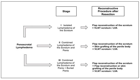 Proposed therapeutic algorithm for the treatment of penoscrotal lymphedema (PL) (according to the proposed treatment-oriented classification presented in Table 1). Prior to any surgical intervention, all conservative treatment options must have been pursued. If these fail, the following surgical options should be considered according to the stage of PL. For resection, standardized incisions should be performed as described previously by us and others [1,3,13]. Reconstruction of the scrotum can then be performed using flaps containing excess skin and subcutaneous tissue from the medial thigh (stage I PL). At stage II PL, reconstruction of the penile body is best accomplished with skin grafting. Due to the extensive skin excess around the mons pubis in stage III PL, sufficient healthy skin and subcutaneous tissue is available for flap reconstruction of the penile body in most cases. If flap reconstruction is not possible due to poor quality of tissue, we recommend skin grafting of the penile body (i.e., analogous to stage II PL). In combination with scrotal and penile reconstruction, we recommend a vascularized lymph node transfer (VLNT) directly into the anatomically affected area of the scrotum, thereby increasing the likelihood of improved lymphatic drainage. Alternatively, lymphaticovenous anastomoses (LVA) can be performed.