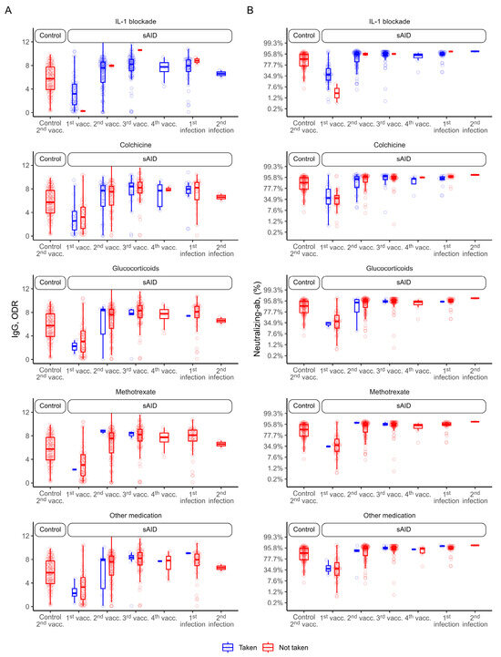 Figure 2. Distribution of antibody levels by type of treatment. “Not taken” here refers to the single drug considered. (A) Anti-SARS-CoV-2 IgG antibodies and (B) SARS-CoV-2 neutralizing antibodies for sAID patients and HCs after COVID-19 vaccination and disease. HC, healthy control; IgG (here), anti-SARS-CoV-2 IgG antibodies; Neutralizing-ab, neutralizing antibodies; ODR, optical density ratio; sAID, systemic autoinflammatory disease; vacc., vaccination.
