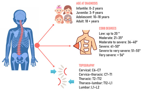 Spinal deformities, particularly scoliosis, represent the most common orthopedic deformities in the pediatric population, with idiopathic scoliosis being the most prevalent form [1]. The spine is characterized by structural changes in the vertebrae that result in rotation and translation relative to the normal body axis [2]. Scoliosis is defined as idiopathic because, until now, no identifiable cause of it has clearly been recognized. Theories include a broad idea of genetic and hormonal factors or more specific causes related to the asymmetric growth of the musculoskeletal system [3]. According to the age of diagnosis, it can be classified as infantile when it occurs between the ages of 0 and 3 years, juvenile when occurring in the age range of 4–10, adolescent at ages 10–18, and adult when diagnosed after the age of 18 [4]. It is important to properly consider the age of onset, since different age ranges have unique physiological aspects to consider, such as bone, muscle, and hormonal maturation (Figure 1). The diagnostic approach comprises clinical analysis using the forward bending test and a scoliometer, followed by X-rays to identify the degree of curvature of the scoliosis. In addition to diagnosis, these methods allow us to observe the condition’s progression and choose the most suitable approach for treatment. According to the Scoliosis Research Society, scoliosis is diagnosed as such only when there is an axial rotation of the vertebrae and the curve is greater than the Cobb angle [5].