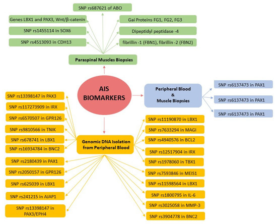 This narrative review considered all articles analyzing AIS through biomarkers involved in the musculoskeletal system. Studies were included if they met the following inclusion criteria: case–control design, diagnosis of AIS, description of genetic and epigenetic factors associated with AIS muscle disorders. Articles were retrieved from Pubmed, Scopus, and Web of Science and were downloaded on EndNote 20 (EndNote 20 desktop version, Clarivate, Philadelphia, PA, USA) [23], and screened in order to identify significant information. Relevant data extracted from selected studies included: number of patients, ethnicity, data collection time window, age, scoliosis classification, method of collection of analyzed samples, biomarker considered, results, and conclusions. We checked if authors correctly addressed the clinical examination of participants before biomarker analysis in order to ensure the correctness of the results. We discussed the articles narratively.