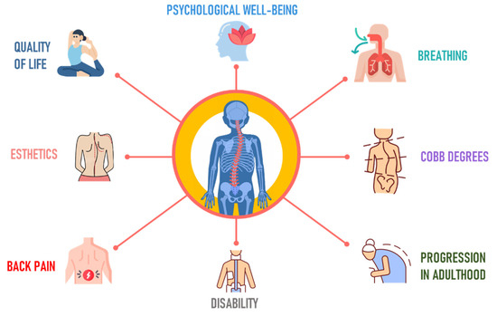 - Gallant, J.-N.; Morgan, C.D.; Stoklosa, J.B.; Gannon, S.R.; Shannon, C.N.; Bonfield, C.M. Psychosocial Difficulties in Adolescent Idiopathic Scoliosis: Body Image, Eating Behaviors, and Mood Disorders. World Neurosurg. 2018, 116, 421–432.e1. [Google Scholar] [CrossRef] [PubMed]