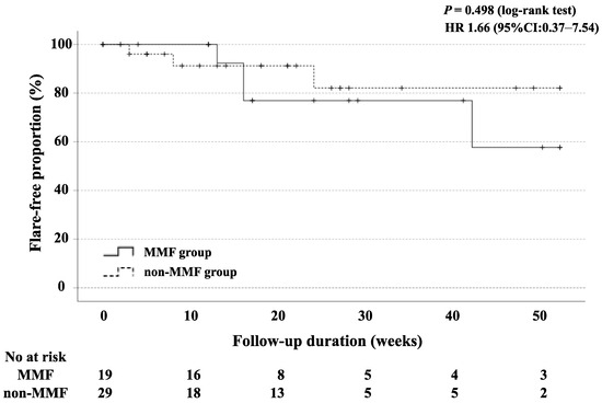 Among 48 patients initiated with BLM, 19 were classified in the MMF group (BLM plus MMF) and 29 in the non-MMF group with BLM alone. We tried to compare the clinical course between these SLE patients treated with BLM and co-treated with and without the use of MMF. The baseline demographics and clinical characteristics of both groups are shown in Table 2. With the exception of lupus nephritis, there was no significant difference in the baseline demographic data between the MMF and non-MMF groups. The changes in the SLEDAI-2K and PSL doses after BLM administration in both groups are shown in Figure 4. Both groups significantly reduced the SLEDAI-2K and PSL doses at 56 weeks compared to the baseline; however, the difference was not statistically significant between the two groups. Similarly, there was no significant difference in the flare-free survival rates between the MMF and non-MMF groups (Figure 5). There was no significant difference in renal involvement, including the changes in eGFR or proteinuria between the patients treated with BLM with or without the concomitant use of MMF.