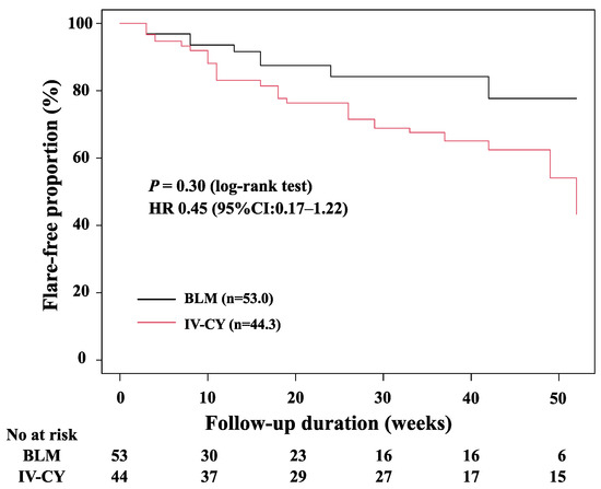 In our study, the mean follow-up time for the BLM group was 17.0 (8.3–27.8) months. The changes in their clinical parameters before and after treatment with BLM or MMF + PSL are shown in Figure 2. The mean SLEDAI-2K score for the BLM group was 12.8 at baseline, 7.0 at 26 weeks, and 6.5 at 52 weeks. After 26 weeks and 52 weeks of treatment, the SLEDAI-2K scores significantly decreased compared to those at baseline (Figure 2A; both p < 0.001). The mean SLEDAI-2K score for the MMF group was 15.8 at baseline, 8.7 at 26 weeks, and 7.5 at 52 weeks. After 26 and 52 weeks of treatment, as in the BLM group, the SLEDAI-2K scores were significantly lower than at baseline, respectively (Figure 2B; both p < 0.001). The mean prednisolone (PSL) dose for the BLM group was 12.8 mg/day at baseline, 9.8 mg/day after 26 weeks, and 10.0 mg/day after 52 weeks. Similarly, after 26 weeks and 52 weeks of treatment, the doses of PSL were significantly reduced compared with those at baseline (Figure 2C; p = 0.009 and p = 0.019). The mean prednisolone (PSL) dose for the MMF group was 28.0 mg/day at baseline, 13.8 mg/day after 26 weeks, and 11.6 mg/day after 52 weeks. As in the BLM group, after 26 weeks and 52 weeks of treatment, the doses of PSL were significantly reduced compared with those at baseline (Figure 2D; both p < 0.001). The flare-free survival at 52 weeks after remission induction therapy was not significantly different between the two groups (Figure 3).