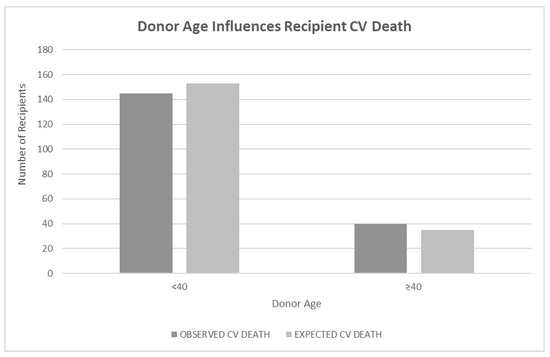 When donor age was investigated as a continuous variable using a Cox proportional hazard regression with the CV death of the recipient as the outcome and donor age as the predictor, the result was insignificant (p < 0.24). A log-rank test of differences using donor age < 40 years old and ≥40 years old as a predictor of recipient CV death showed a significant difference in CV death of recipients if the donor was older than 40 years old (p < 0.05) (Figure 1).