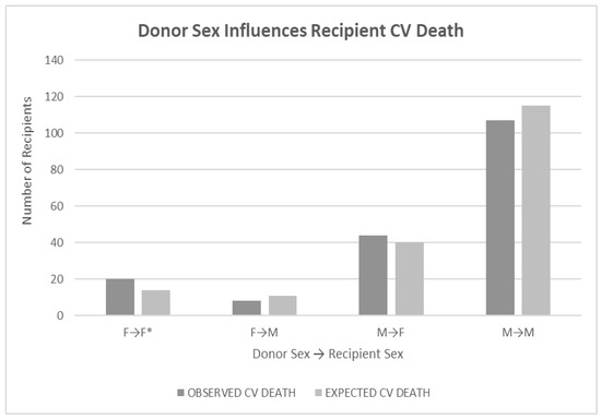 Recipients with female donor hearts experienced CV death more frequently (p < 0.05) if the recipient was female (p < 0.05), but the result was not significant if the recipient was male (the starred comparison in Figure 2). Recipient sex was not as influential on CV death (p < 0.09). Analysis was performed using a log-rank test of differences. Evaluation of donor-recipient sex mismatches also showed no significance for any combination (p < 0.62).