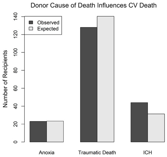 We compared donor age, COD, and sex with the frequency of recipient CV death or retransplantation (according to UNOS criteria) using logistic regression, a log-rank test of differences, and Tukey contrast. R version 4.3 (2023) was used for the analysis. p-values < 0.05 were considered significant. UNOS criteria for CV death include death from acute rejection, acute myocardial infarction, acute arrhythmia, heart failure, or CAV [14,15]. For the analysis of the relationship of various CODs to CV death, the CODs were grouped as anoxia, traumatic death (TD, which includes MVD, BHT, and GSW), and ICH. The log-rank test tests whether the 3 groups have similar survival patterns and then computes the expected number of CV deaths in each group based on the time that the patients spend in the cohort (time to CV death or censoring). That is the expected category. Then, it compares the actual number of CV deaths to the expected number for each group [16].