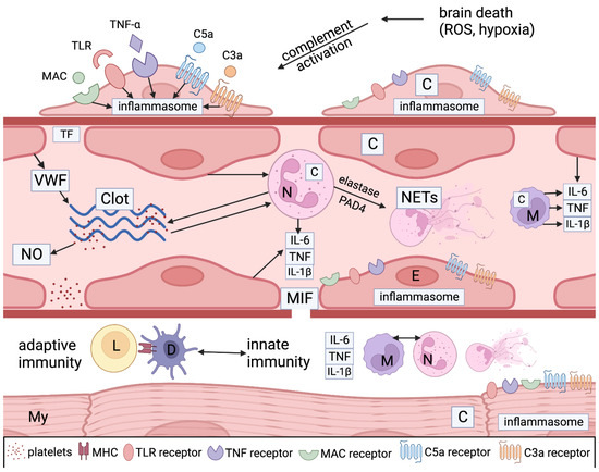 Legend: A simplified graphical illustration of the mechanisms of injury in donors after brain death. Ischemic stress and cell death lead to complement activation through the classical, alternative, and lectin pathways. DAMPS, such as the TLR ligand, TNF a, and complement components like C3a, C5a, and C5b-9 (MAC), bind with PRR receptors on pericytes (P), endothelial cells (E), neutrophils (N), and macrophages (M) to induce inflammasome assembly and release pro-inflammatory mediators like tumor necrosis factor alpha (TNFa), interleukin 6 (IL-6), and interleukin 1 beta (IL-1b). Microvascular endothelial cells, pericytes, myocytes (My), and inflammatory cells make more complement proteins (C) and inflammatory cytokines as well as macrophage inhibitory factor (MIF), which leads to gaps in the basement membrane, promoting vascular permeability and extravasation of neutrophils and macrophages and activating dendritic cells (D). Neutrophil activation and neutrophil extracellular trap (NETS) generation (through the action of elastase and PAD4) also play a pivotal role. They stimulate coagulation and complement activation, creating positive feedback loops between endothelial cells and platelets. Platelets generate nitrous oxide (NO), another potent mediator. Endothelial cells elaborate von Willebrand factor (VWF), which is an important accelerator of coagulation. Cell necrosis caused by the autoinflammatory process exposes cellular HLA antigens that initiate allorecognition by involving donor macrophages and dendritic cells (D), as well as potential autoimmunity against myocyte and endothelial antigens. Myocyte injury can be initiated by ischemia generated by the vascular injury and by adaptive and autoimmunity against myocyte donor-specific antigens (MHC) and others.