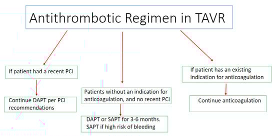 There are two major clinical trials that assessed the addition of antiplatelet therapy to anticoagulation therapy in patients undergoing TAVR who have a concomitant indication for anticoagulation therapy; these two trials are the POPULAR-TAVI trial cohort B and the ENVISAGE-TAVI AF trial [8,9]. In the POPULAR-TAVI trial cohort B, which included 313 patients on oral anticoagulation who were randomized to clopidogrel post TAVI (157 patients were randomized to oral anticoagulation only and 156 patients were randomized to oral anticoagulation with clopidogrel) [8], the investigators demonstrated that bleeding occurred in 21.7% receiving oral anticoagulation alone and in 34.6% receiving oral anticoagulation plus clopidogrel (risk ratio, 0.63; 95% CI, 0.43 to 0.90; p = 0.01). Most bleeding events were at the TAVI access site [8]. Similarly, non-procedure-related bleeding occurred in 21.7% and in 34.0%, respectively (risk ratio, 0.64; 95% CI, 0.44 to 0.92; p = 0.02). There was no difference in the ischemic events, including cardiovascular death, stroke and myocardial infarction, between the groups [8]. The ENVISAGE-TAVI AF trial, in which 1426 patients were randomized to Edoxaban or a vitamin K antagonist, demonstrated no difference in the rates of death or stroke between the two groups, with evidence of higher gastrointestinal bleeding in the Edoxaban group [9]. In summary, these trials demostrated that patients who have an existing baseline indication for anticoagulation should continue anticoagulation alone, without the need to add antiplatelet therapy; as the addition of antiplatelet therapy is associated with higher bleeding risk, without a difference in ischemic events.