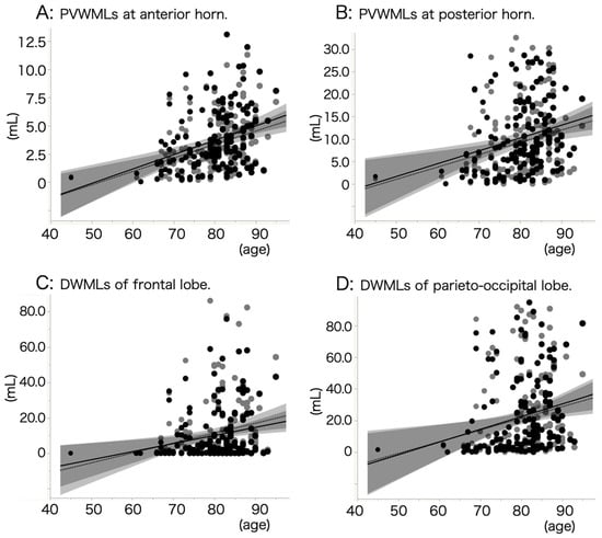 Correlation between severity of WMLs and age. There was a significant correlation between age and PVWML volume in anterior horn of lateral ventricle (A). The formula of regression line on the left is Y = 119.5X − 6240; r = 0.361; p < 0.001. The formula on the right is Y = 127.7X − 6516; r = 0.346; p < 0.001. There was a significant correlation between age and PVWML volume in posterior horn of lateral ventricle (B). The formula of regression line on the left is Y = 27.4X − 1272; r = 0.245; p = 0.002. The formula on the right is Y = 28.6X − 1268; r = 0.265; p = 0.001. There was a significant correlation between age and DWML volume in frontal lobe (C). The formula of regression line on the left is Y = 56.0X − 3345; r = 0.245; p = 0.003. The formula on the right is Y = 45.8X − 2658; r = 0.224; p = 0.004. There was a significant correlation between age and DWML volume in parieto-occipital lobe (D). The formula of regression line on the left is Y = 74.0X − 3787; r = 0.224; p = 0.006. The formula on the right is Y = 80.4X − 4193; r = 0.245; p = 0.003. Gray and black dots indicate data for left and right sides, respectively. Dotted and solid lines indicate the regression lines of left and right sides, respectively.