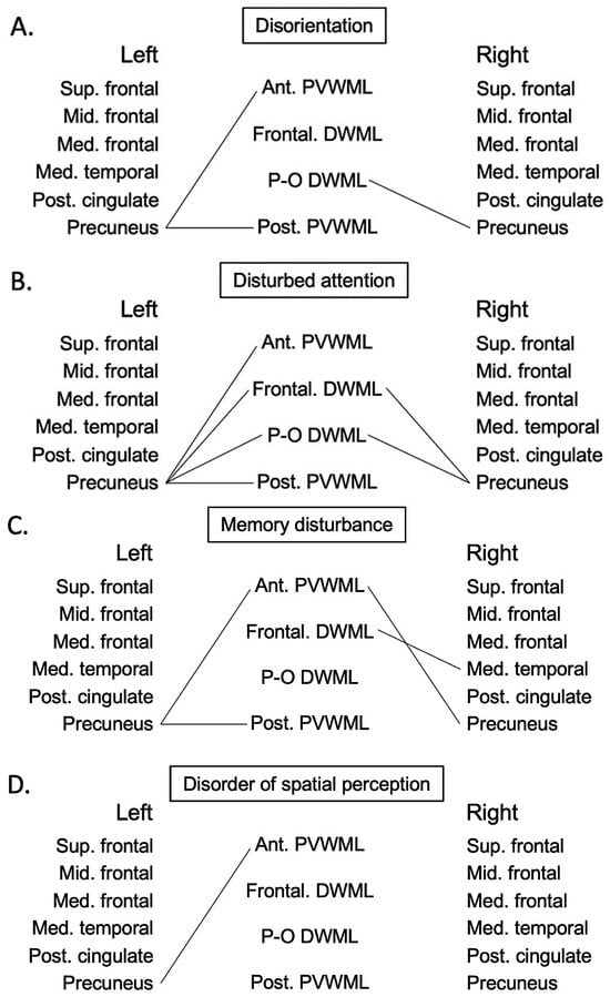 Logistic regression analysis was adopted to evaluate the involvement of GMLs and WMLs in subcategories of cognitive impairment (Supplementary Table S1). Disorientation was negatively correlated with the Z-score in the right medial temporal cortex (r = −0.9594; p = 0.0010). Disturbed attention was positively correlated with the volume of the PVWML in the right posterior horn, positively correlated with the Z-score in the left superior frontal cortex, negatively in the left middle frontal cortex, and positively in the left posterior cingulate cortex (r = 0.0011, p = 0.038; r = 1.5469, p = 0.037; r = −1.4529, p = 0.0036; and r = 0.6934, p = 0.0456, respectively). Memory disturbance was negatively correlated with the Z-score in the left middle frontal cortex (r = −1.3585; p = 0.0232). Disorder of spatial perception was negatively correlated with the volume of PWMLs in the right anterior horn (r = −0.0007; p = 0.0329) and positively correlated with the Z-score in the right middle frontal cortex (r = 1.8756; p = 0.0490). No significant correlation was observed regarding the impairment of language skill.