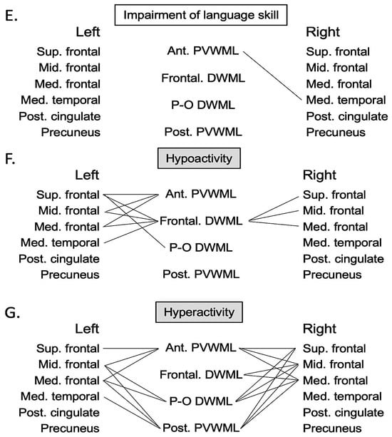 Significant correlations between GMLs and WMLs in each symptom (A) disorientation, (B) disturbed attention, (C) memory disturbance, (D) disorder of spatial perception, (E) impairment of language skill, (F) hypoactivity, and (G) hyperactivity. Significant correlation is shown by solid line between two lesions. Statistical data of each line are presented in Supplementary Tables. Sup.: superior; mid.: middle; med.: medial; post.: posterior; ant.: anterior; P-O: parieto-occipital.