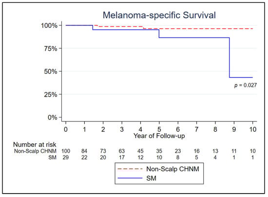 - Ozao-Choy, J.; Nelson, D.W.; Hiles, J.; Stern, S.; Yoon, J.L.; Sim, M.S.; Faries, M.B. The prognostic importance of scalp location in primary head and neck melanoma. J. Surg. Oncol. 2017, 116, 337–343. [Google Scholar] [CrossRef]