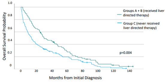 Analysis of survival from the time of initial diagnosis of neuroendocrine neoplasm (Figure 2) revealed a significantly increased median OS for patients who received LDT at any time in their disease course (29.9 vs. 13.5 months, p = 0.004). Of those who received LDT (Groups A and B), there was no significant difference in median OS between those that had additional sites of metastasis outside of liver and bone at the time of their LDT and those that did not (25.1 vs. 34.6 months, p = 0.889). However, those that underwent surgical resection or ablation had significantly improved survival when compared with those that underwent embolization therapy or no LDT (median OS 63.2 vs. 23.3 vs. 13.5 months, p < 0.001). The hazard ratio was 0.40 and 0.81 for the patients who had undergone surgical resection/ablation and embolization, respectively.