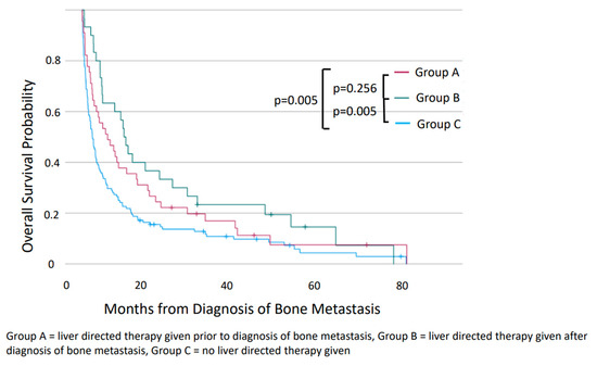 A comparison of patients who never received LDT (Group C) with those who received LDT after a diagnosis of bone metastases (Group B) revealed no significant difference in age (59.6 vs 54.7 years, p = 0.080), race/ethnicity (p = 0.472), Charlson comorbidity score (p = 0.423), the proportion of patients with at least one additional site of metastasis outside of bone or liver at the time of bone metastasis diagnosis (33.3% vs. 51.1%, p = 0.462), or tumor grade (p = 0.343). However, a comparison of patients in Group B with those in Group A did reveal a significantly higher Charlson comorbidity score (Charlson comorbidity score ≥2 in 60% vs. 24.4%, p = 0.001), while there were no significant differences in age (54.7 vs. 54.0 years, p = 0.807), race/ethnicity (p = 0.178), the proportion of patients with at least one additional site at time of bone metastasis diagnosis (33.3% vs. 40.6%, p = 0.129), or grade (p = 0.449). Of note, patients in Group B were also more likely to undergo radiation therapy than those in Group A (33.3% vs. 8.9%, p = 0.008). There was no significant difference between Groups A and B in the percentage of patients who had additional sites of metastasis outside of liver and bone at the time of their LDT (36.7% vs. 20.0%, p = 0.110). The time interval between the diagnosis of liver and bone metastases was significantly shorter in patients who received LDT after the diagnosis of skeletal involvement (Group B) than in those who received it before (Group A), with a median time of 0 months between diagnoses versus 19.9 months (p < 0.001). There was no significant difference in the time interval between diagnoses when compared with patients in Group C (0 vs. 0 months, p = 0.678).