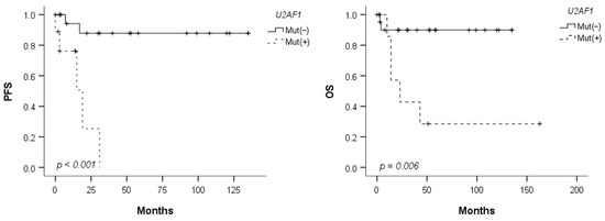 Progression-free survival (PFS) and overall survival (OS) according to the U2AF1 mutation status.
