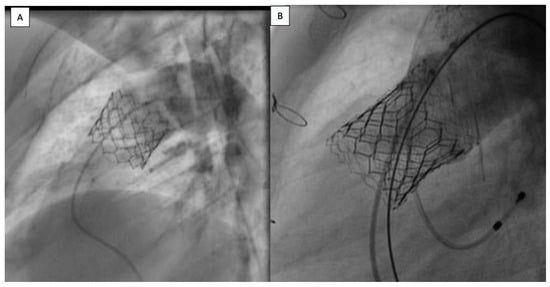(A) Sapien 3 valve, implanted without prestenting in native patched RVOT. (B) Sapien 3 valve, implanted with prestenting in native patched RVOT. RVOT: right ventricle outflow tract.