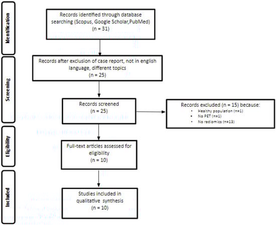 The PRISMA flowchart of the articles included in our review is reported in Figure 1. The literature search identified a total of 31 studies. According to the aforementioned eligibility criteria, 10 studies were included [,,,,,,,,,]. Among these, eight studies were retrospective and two prospective. Furthermore, only one study was performed using [68Ga]Pentixafor [], while all the others used [18F]FDG as the radiotracer (Table 1).