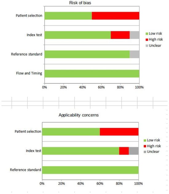 The overall evaluation of the risk of bias and concerns regarding the applicability of the studies included in the systematic review according to QUADAS-2 is presented in Figure 2.