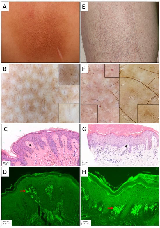 The diagnosis of PLCA should be confirmed by histopathology, where the deposition of eosinophil, amorphous globular material in the papillary dermis, melanophages, and increased pigmentation of the basal layer are typically observed. In LA, acanthosis and hyperkeratosis can also be seen. The reduced number of nerves within the dermo-epidermal junction and the epidermis has also been reported []. Special stains (Congo red, Crystal violet, Thioflavin T, periodic-acid-Schiff method, Sirius red) can be used for more defined visualization of the amyloid [,].