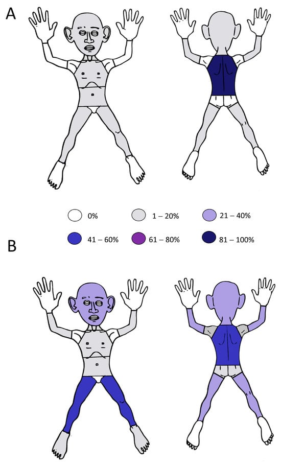 Distribution of the involved body regions in macular (A) and in lichen (B) amyloidosis types of primary localized cutaneous amyloidosis.