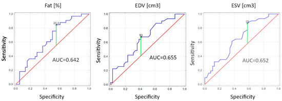 Receiver-operating curve (ROC) for the fat (%), end-diastolic volume (EDV) and end-systolic volume (ESV) variables revealing their diagnostic potential. AUC—area under the ROC curve; blue line—graphical plot of studied parameter determining the area under the curve, green line—the line pointed at Youden point, red line—reference line.