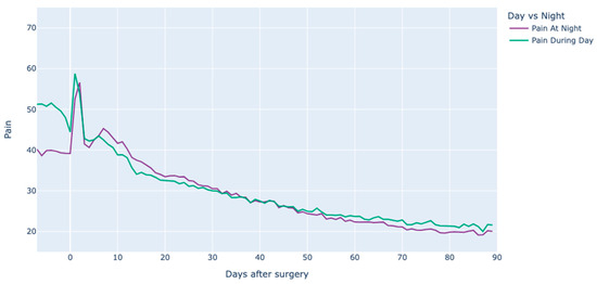 Preoperative pain intensity was reported to be greater during the daytime as opposed to nighttime (Figure 2). A notable peak in pain was recorded within the initial two days post-surgery, which then subsided by the third day and approached a plateau around day 45.