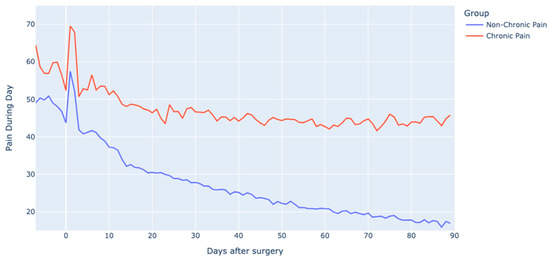 During the first and second weeks post-surgery, the chronic pain cohort consistently reported elevated pain levels relative to the non-chronic pain cohort, with these disparities proving to be statistically significant. Over time, the divergence in pain trajectories became more pronounced (Figure 3). The pain levels in the chronic pain cohort began to plateau after three weeks, while those in the non-chronic pain cohort continued on a declining trend.