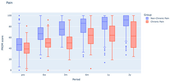 Box plots illustrating the distribution of KOOS pain in chronic and non-chronic pain groups over a 2-year duration. PROM: Patient reported outcome score for KOOS pain.