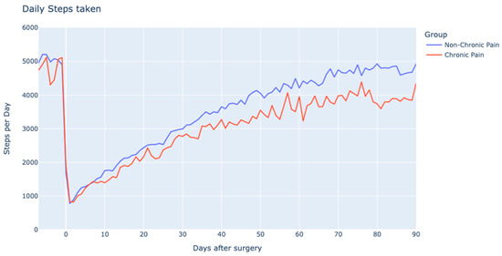 Recovery of physical activity level (number of steps/day) in chronic and non-chronic pain groups. Rel to surgery: relative to surgery.
