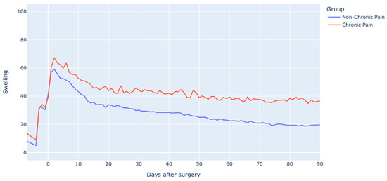 Preoperative physical activity levels, approximating 5000 steps/day, were comparable between the groups. Any differences in early postoperative physical activity were minimal, but tended to grow over time (Figure 5). Similarly, patient-reported swelling showed no preoperative variance but escalated as time progressed (Figure 6). The duration of NSAID use differed between the groups; patients with chronic pain used NSAIDs for a median of 51 days (IQR 31–76 days), while those without chronic pain had a shorter duration of 33 days (IQR 21–58 days).