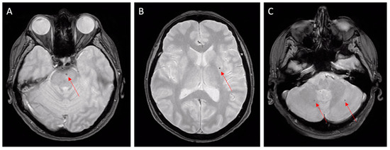 Hypertensive microangiopathy. Brain MRI, axial T2 gradient-echo images. Red arrows show microbleeds in the brain stem (A), left basal ganglia (B), and cerebellum (C). Deep localizations are typical features of hypertensive microbleeds.