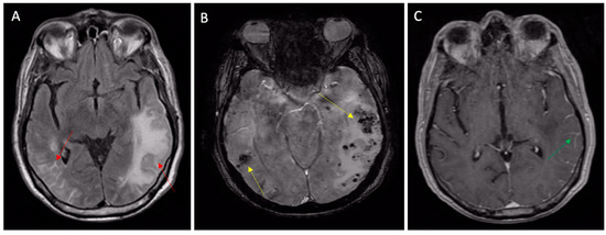 Inflammatory CAA presenting with TIA-MIMIC (transient aphasia). (A) MRI FLAIR sequences showing vasogenic edema (left arrow) and leptomeningeal inflammatory hyperintensities (right arrow); (B) susceptibility-weighted imaging MRI showing subcortical microbleeds (yellow arrows) and (C) leptomeningeal post contrast enhancement (green arrow) on T1 sequences.