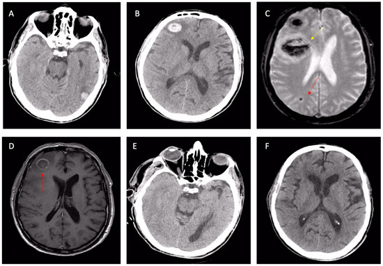 Cerebral involvement from confirmed bacterial endocarditis. (A,B) NECT showing left-temporal and right-frontal atypical hematomas linked with suspected CAA or cavernomas, according to radiologists. Same patient: second-line T2* brain MRI (C) with a further frontal lesion (yellow arrow) and subcortical microbleed (red arrow); the first two lesions are shown with signal loss in T2* sequences. The T1 post-contrast MRI (D) with ring enhancement (red arrow) raised the suspicion of an infective lesion. Control NECT after 3 weeks of antibiotic therapy (E,F): the complete disappearance of both frontal and temporal lesions, confirming cerebral emboli from endocarditis. Abbreviations: NCET, non-enhanced computed tomography; CAA, cerebral amyloid angiopathy.