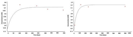 Two examples of the evolution of local lactate concentration (red dots: patient data; black curve: model simulation) in a WHO IV glioma [57]. In vivo measurements fit in silico predictions.