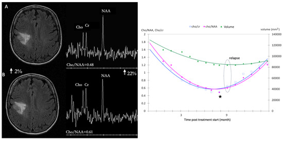 Radiomics allows the conversion of imaging data into a high dimensional feature space using an automated data mining algorithm [89,90,91], thus overcoming single parameter analysis in patients with glioblastomas. It assesses the spatial heterogeneity of brain tumors, using clinically feasible and commonly performed T1-weighted, T2-weighted, and fluid-attenuated inversion recovery (FLAIR) MRI. They can improve the estimation of prognoses [92] and the determination of treatment response to anti-angiogenic therapy. Both perfusion WI and 1H-MRS have emerged as potential prognostic factors for the outcomes of glioma patients under chemotherapy. For high grade gliomas under bevacizumab, both dsc and dce markers are relevant [89,90,92,93]. For LGG under TMZ [94], the mean relative decrease of metabolic ratios, mean (D(Cho/Cr)n/(Cho/Cr)o), at n = 3 months is predictive of tumor response over the 14 months of follow-up (Figure 5). The mean relative change between metabolic ratios, mean ((Cho/NAA)n(Cho/Cr)n)/(Cho/NAA)n, at n = 4 months is predictive of tumor relapse with a significant cutoff of 0.046, a sensitivity of 60% and a specificity of 100% (p = 0.004), Figure 5.