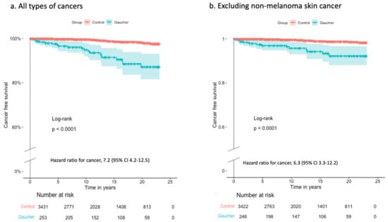 Cancer-free survival after the index date for patients with GD and controls was assessed using Kaplan–Meier methods, and comparisons were made using the log-rank test. Cancer incidence rates among patients with GD and controls were calculated and compared using the incidence rate ratio with 95% CI. Cases diagnosed with cancer before the index date were excluded from these analyses. The probability of cancer was assessed for the first presenting cancer in patients diagnosed with multiple cancers. Analyses were performed with and without including patients developing non-melanoma skin cancer (NMSC).