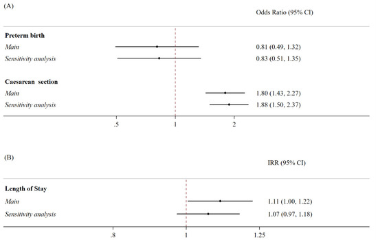 Association between SARS-CoV-2 positivity and the risk of preterm birth, caesarean section deliveries, and percentage increase in the hospital length of stay for delivery. Notes: (A) The binary outcomes were modeled using multivariable logistic regression models, controlled for age at the time of delivery, caesarean section (if not the outcome), and the Obstetric Comorbidity Index. For the main analyses, the models were further adjusted for three-month study periods, whilst the sensitivity analyses for time were divided according to changes in the most prevalent SARS-CoV-2 variant, rather than the three-month study period. The analyses were presented as odds ratios (ORs) and 95% confidence intervals (95% CI). C-section: caesarean section. (B) The outcomes were modeled by employing multivariable Poisson regression models, controlled for age at the time of delivery, caesarean section, and Obstetric Comorbidity Index. For the main analyses, the models were further adjusted for three-month study periods, while in the sensitivity analyses, time was divided according to changes in the most prevalent SARS-CoV-2 variant, rather than three-month study periods. The analyses were presented as incidence rates (IRRs) and 95% confidence intervals (95% CI).