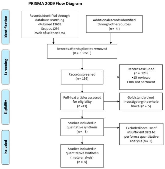 After a bibliography search, five studies were included in the analysis [,,,,]. Such studies are reported in Table 1. The process of study selection is summarized in Figure 1. All studies but one [] were performed in the adult population. Three studies were performed in the UK [,,] and two in Italy [,]. All studies used PEG as an oral contrast agent, with final volume ranging from 250 mL to 1000 mL. Overall, 325 patients with CD were recruited.