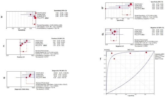 This analysis was possible for only forty patients overall in three studies [,,]. SICUS demonstrated a pooled sensitivity of 100% (95% CI 59–100%), a specificity of 90% (95% CI 74–98%), a positive LR of 6.34 (1.94–21.17), a negative LR of 0.13 (0.02–0.84), and a DOR = 53.08 (5.07–555.11). It was not possible to calculate the AUC of SROC. Such results are reported in the plots of Figure 4. Of note, since one study provided several zero values, the corresponding diamond in the plots was not drawn in the figures.