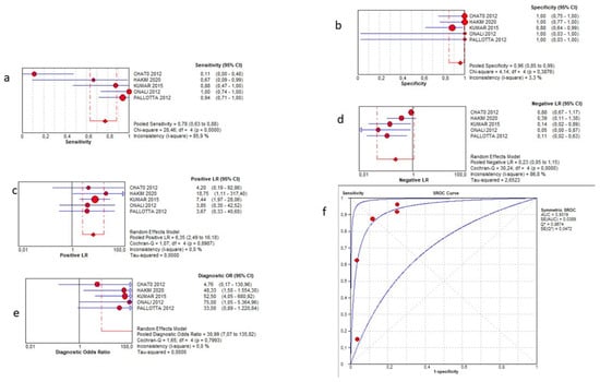 Sensitivity (a), specificity (b), positive likelihood ratio (c), negative likelihood ratio (d), diagnostic odd ratio (e), and AUC (f) for diagnosis of CD.