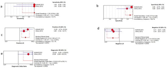 Sensitivity (a), specificity (b), positive likelihood ratio (c), negative likelihood ratio (d), and diagnostic odd ratio (e) for fistulae detection.